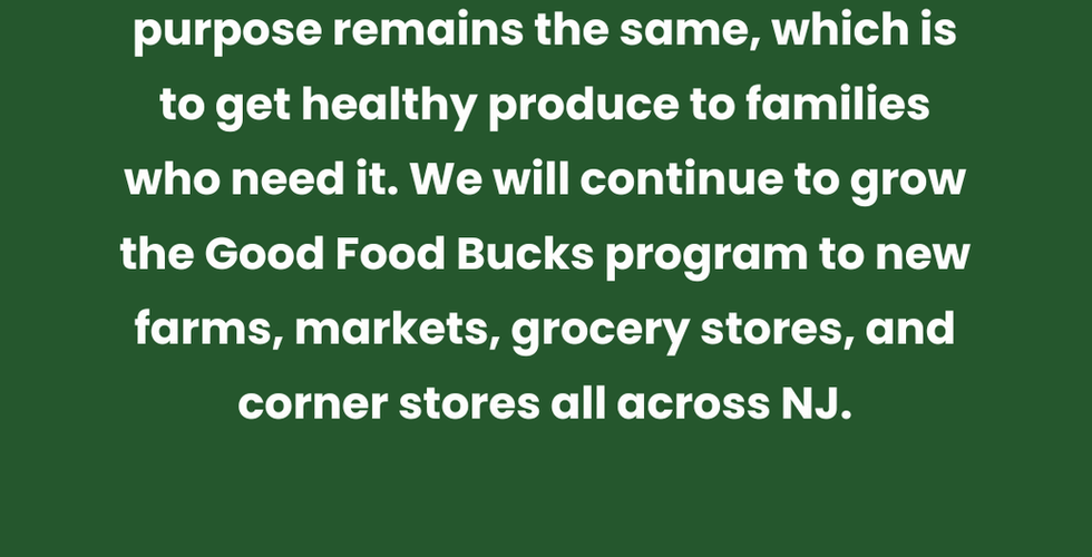 Despite these challenges, our purpose remains the same, which is to get healthy produce to families who need it. We will continue to grow the Good Food Bucks program to new farms, markets, grocery stores, and corner stores all across New Jersey. We would like to thank all of our retail and farm partners for providing this program to their communities, and are also grateful for the support from our donors, legislative supporters, and all of our partners who similarly help to support food access in New Jersey.
